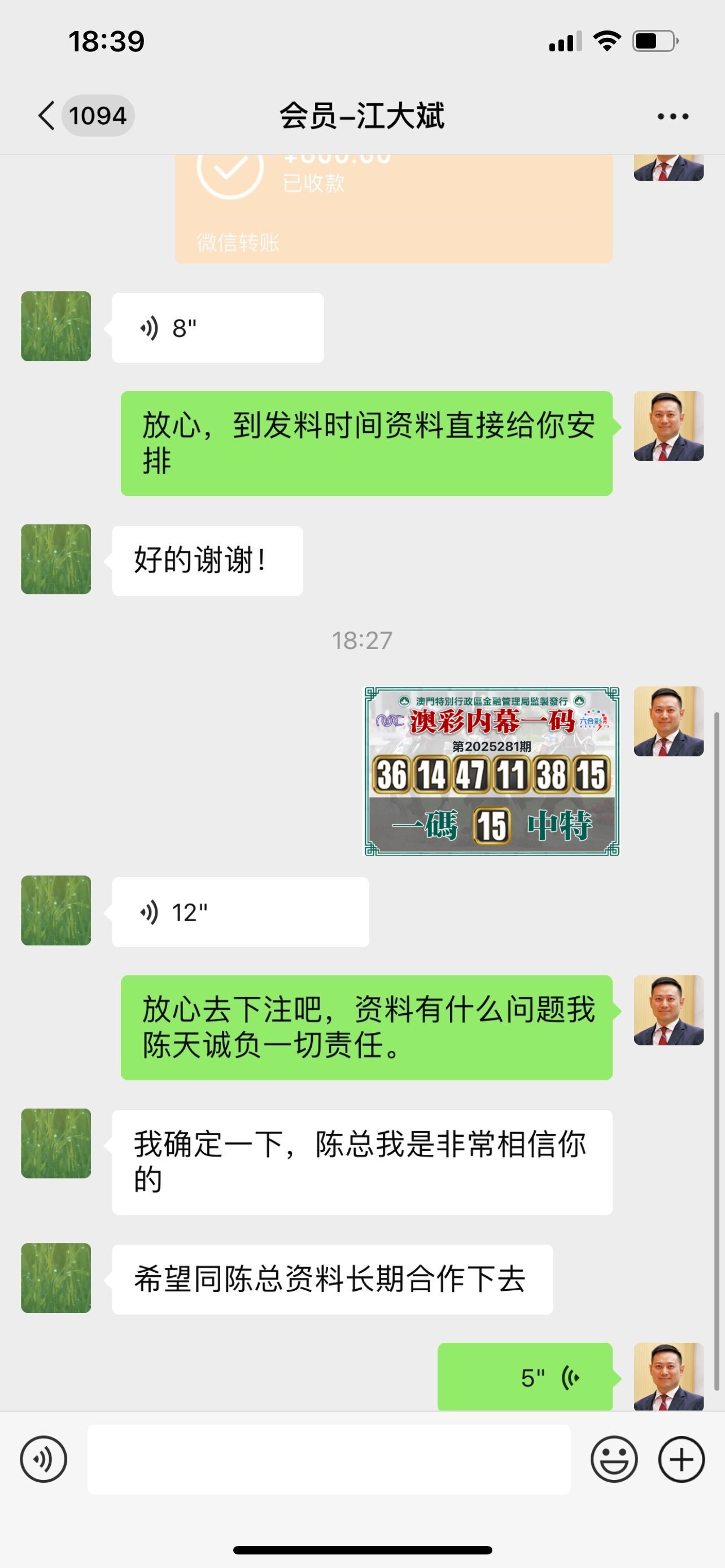 你好我叫杨良日,湖南人,这几年在家都是种植什么的,收成非常不好,连连都是亏本的。我就以为买点六合彩可以发一点小财,结果还越输越多。现在欠了好多债,种植业也搞不下去了。今天看到你陈总的资料,看了很久,资料更新及时,还非常准,我转了600元会员费到你微信上了,您查收一下。我相信你能让我早日摆脱困境,中奖我一定给你发一个大大红包,希望我们合作愉快!祝愿陈总,身体健康,心想事成!财源滚滚!