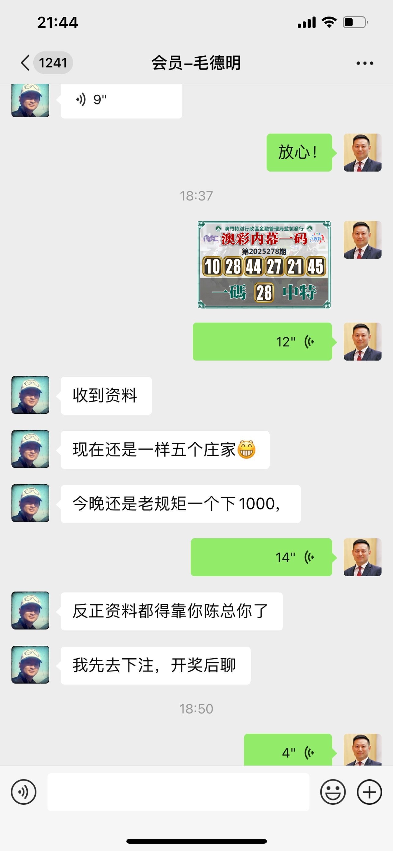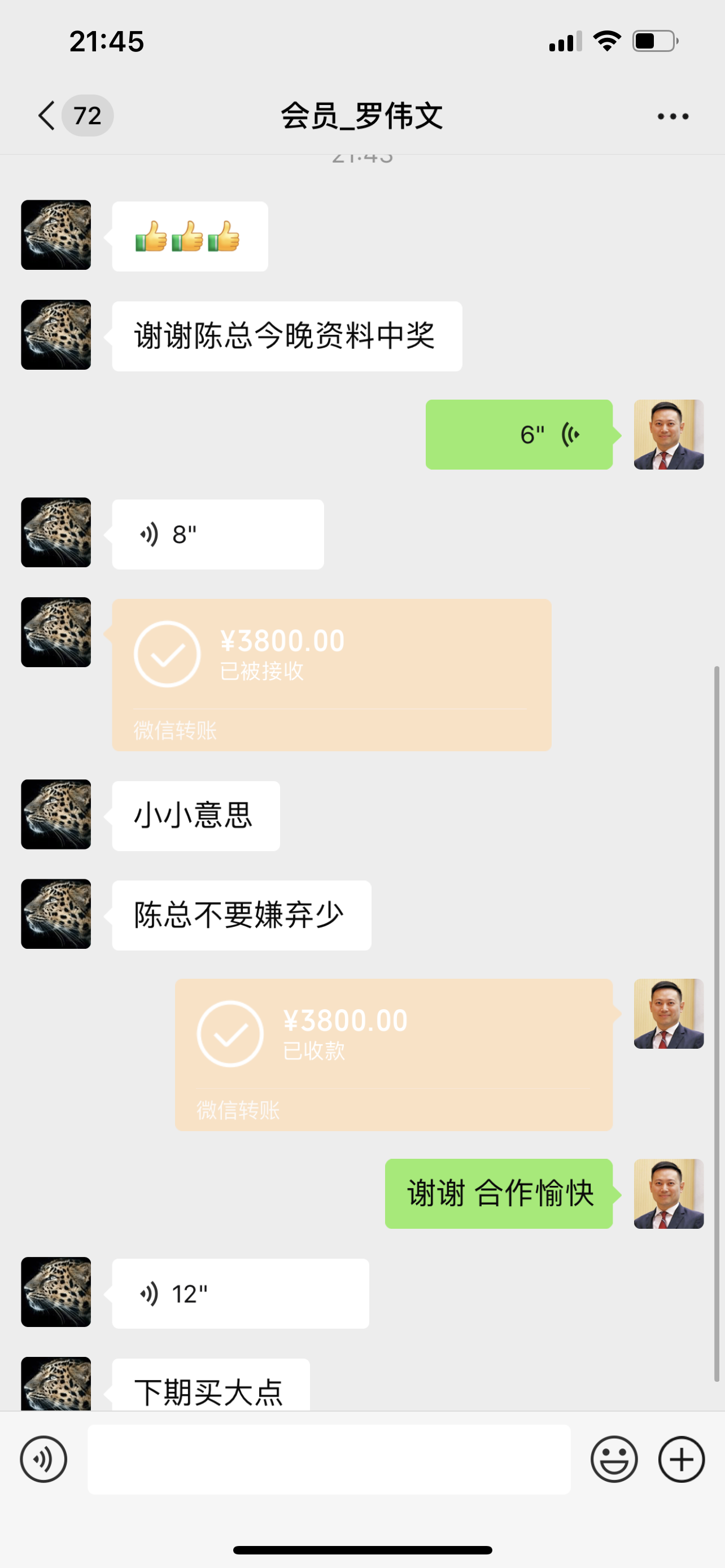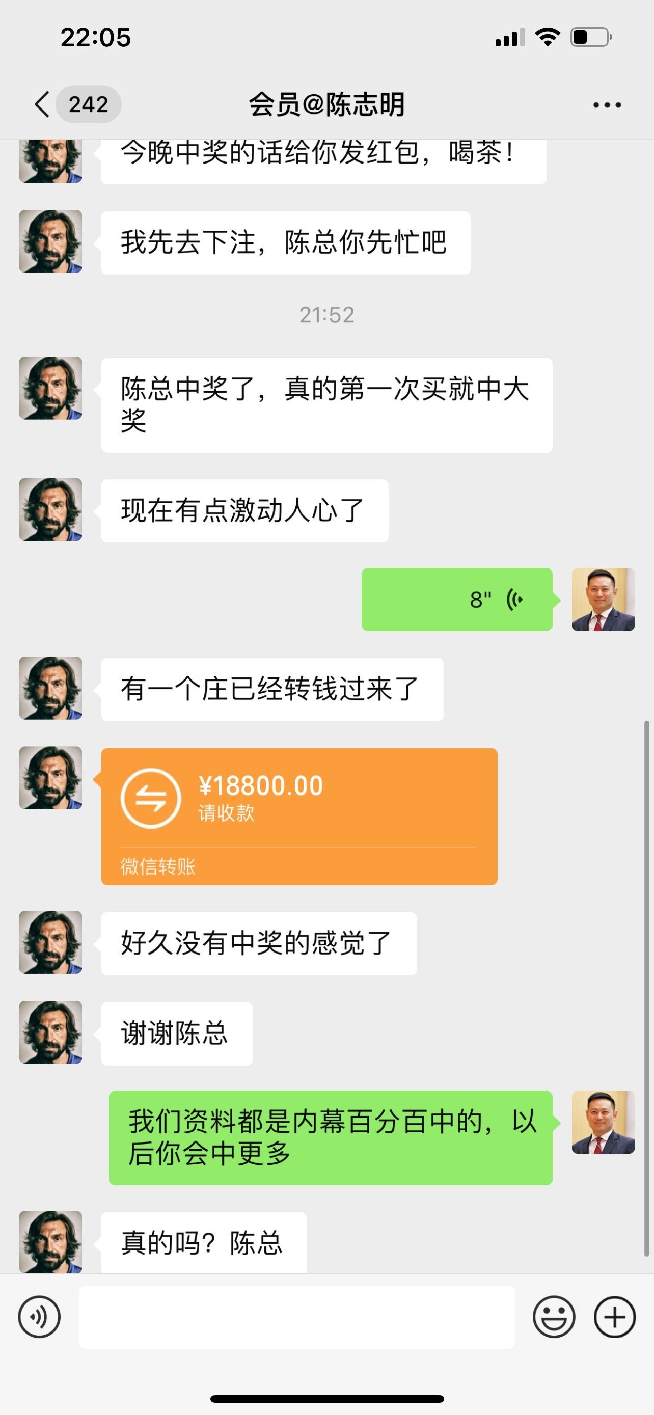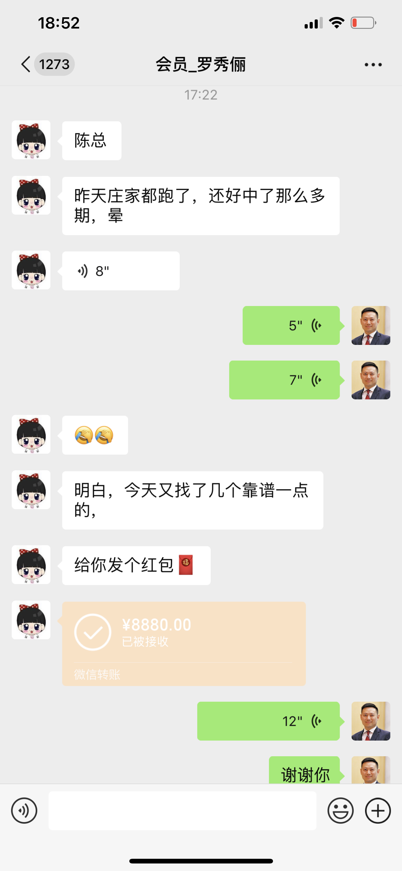 陈总你的资料太准了,昨晚中的钱刚从庄家那里拿回来,没找你之前输了十几万了,昨晚总算中回来一点了,以后就跟着你赚钱了。红包少不了你的,等我还清债务就发大红包感谢陈总!