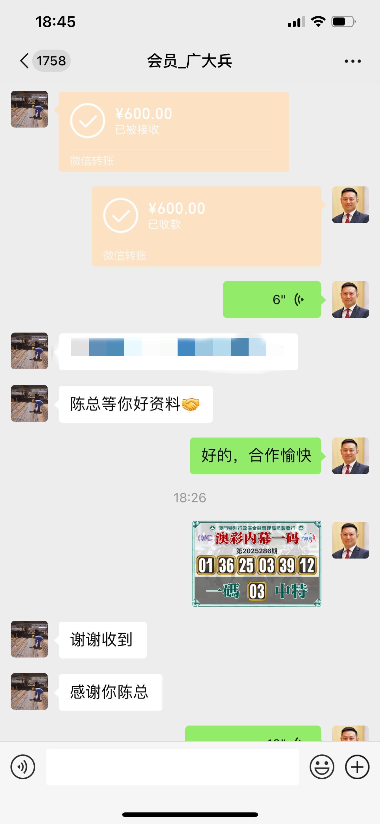 陈总你好,昨天我在浏览一些六合彩资料就看到你这份澳彩内幕一码了,反复看了一下午感觉非常可以,我这几年玩六合彩也是输得很惨,从来没赢过,把打工存的血汗钱都输完了,希望你能帮帮我,600元我在手机银行转给你了,麻烦帮我办理好,今晚中了奖也一定不会少你红包的。