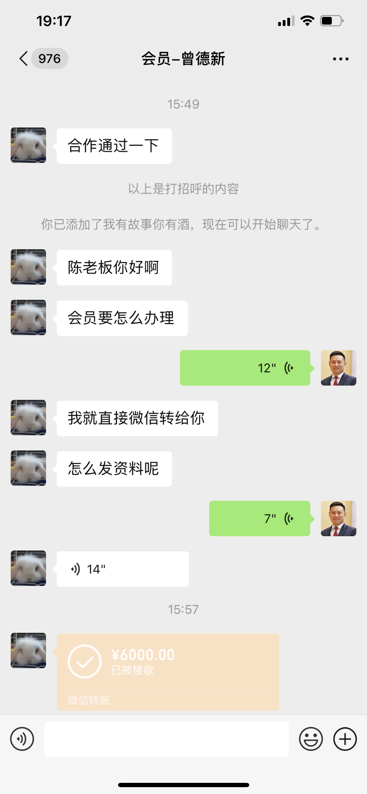 陈总听说你的资料很准?也不知道真不真,反正观察了一段时间了,目前看是很准的,然后我就忍不住入会了,600元会费已经转给你了,希望尽快帮我办理会员,迫不及待等着今晚下注啦。我们合作愉快啊